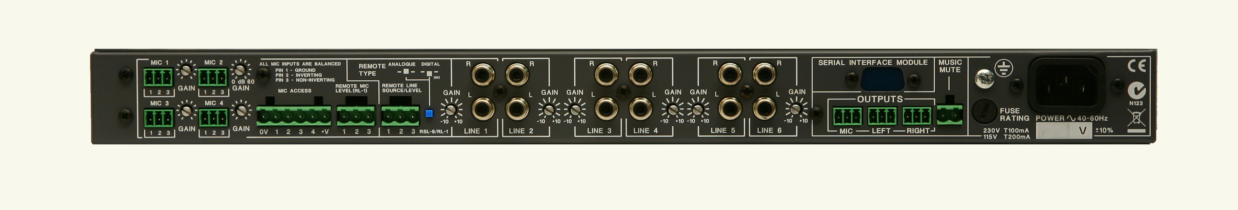 - 6 Line-Eingänge mit Gain-Reglern (Musiksektion)