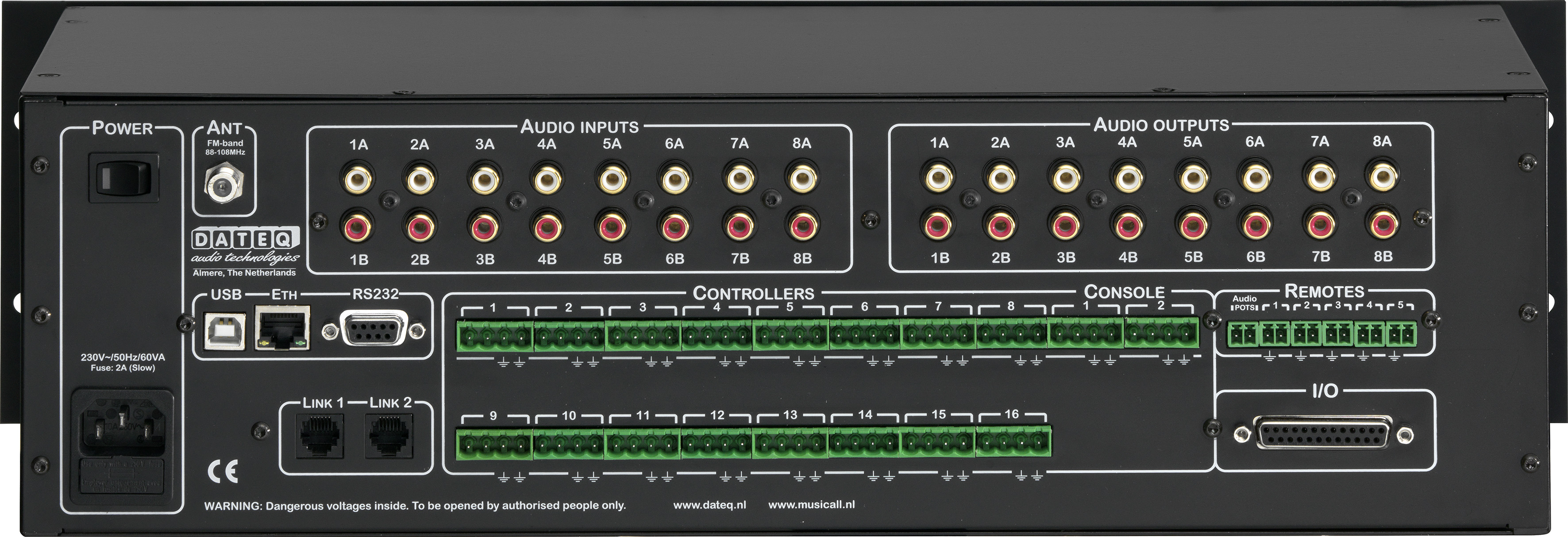 Das MusiCall Durchsage-System ist ein Audio-Distribution-System, mit dem sich mehrere Quellen auf 8 bis zu maximal 16 Zonen verteilen lassen. Mit Hilfe der Fernsteuereinheiten (MRC) oder des internen Webservers kann für jede Zone die gewünschte Audioquelle und Lautstärke ferngesteuert eingerichtet werden.