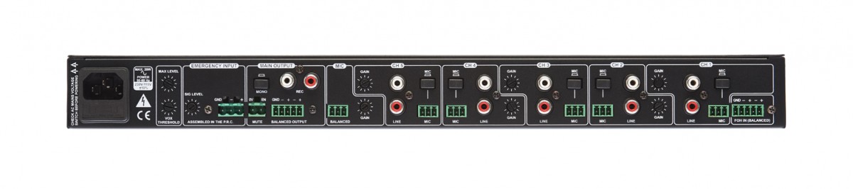 Der Mixer verfügt über fünf Hauptkanäle mit jeweils einem symmetrischen Mikrofon- und einem unsymmetrischen Stereo-Line-Eingang. Alle Anschlüsse befinden sich auf der Rückseite. Der zusätzliche stereophone Auxiliary-Line-Eingang lässt sich wahlweise über einen symmetrischen Anschluss auf der Rückseite oder – ideal für den einfachen Anschluss von Tablets, Laptops o. ä. – über eine unsymmetrische 3,5 mm Klinkenbuchse auf der Vorderseite belegen. Ein weiterer, unabhängiger Mikrofoneingangskanal wird ebenfalls auf den Hauptausgang geroutet. Dieser Kanal bietet eine regelbare VOX-Erkennung für Durchsagen mit automatischer Absenkung der Programmkanäle. Der Schwellwert für die VOX-Erkennung lässt sich über einen Preset-Regler auf der Rückseite anpassen. Die Absenkung der Programmwiedergabe wird auf der Vorderseite eingestellt.